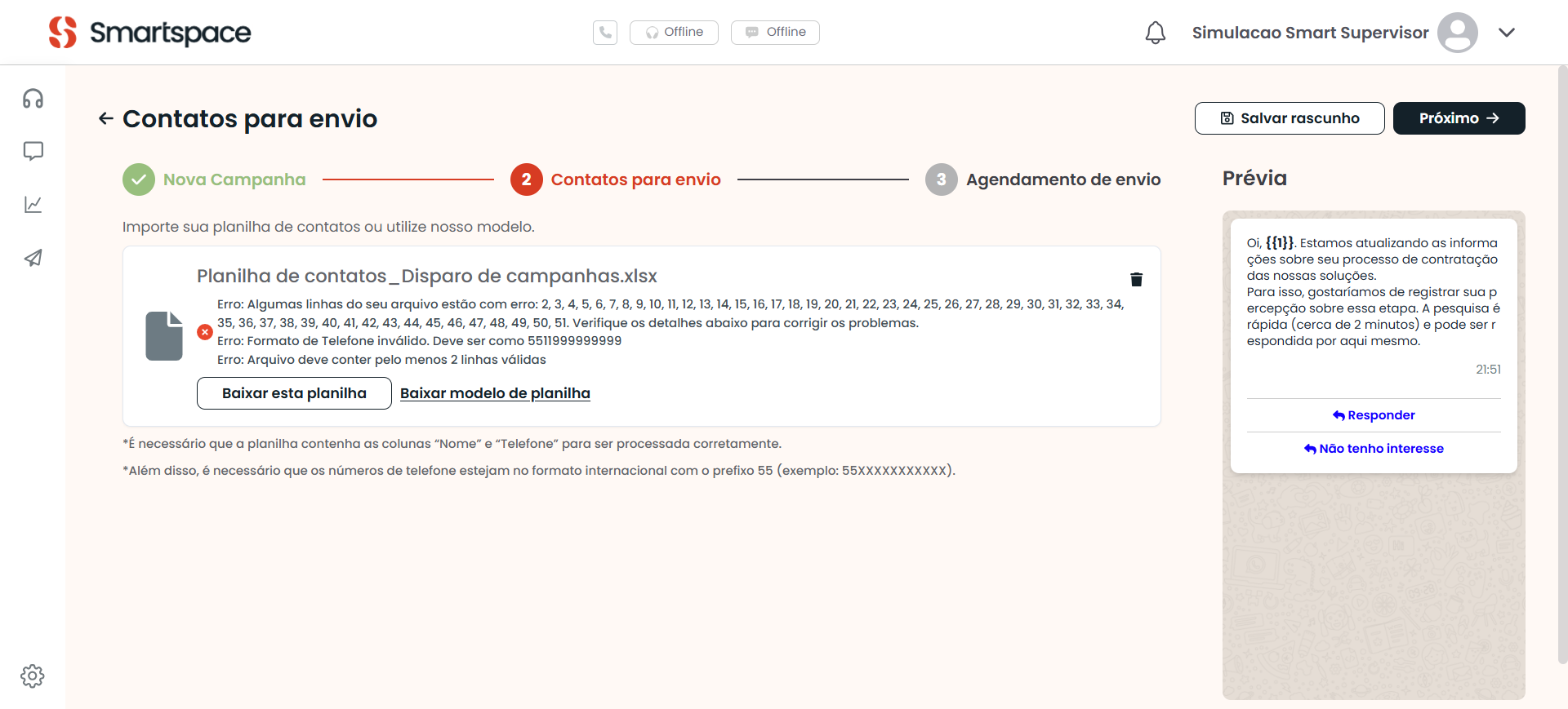 Segunda etapa da Configuração: Na aba Contatos para envio faça upload da planilha contendo "nome" e "número do WhatsApp" dos destinatários da campanha.