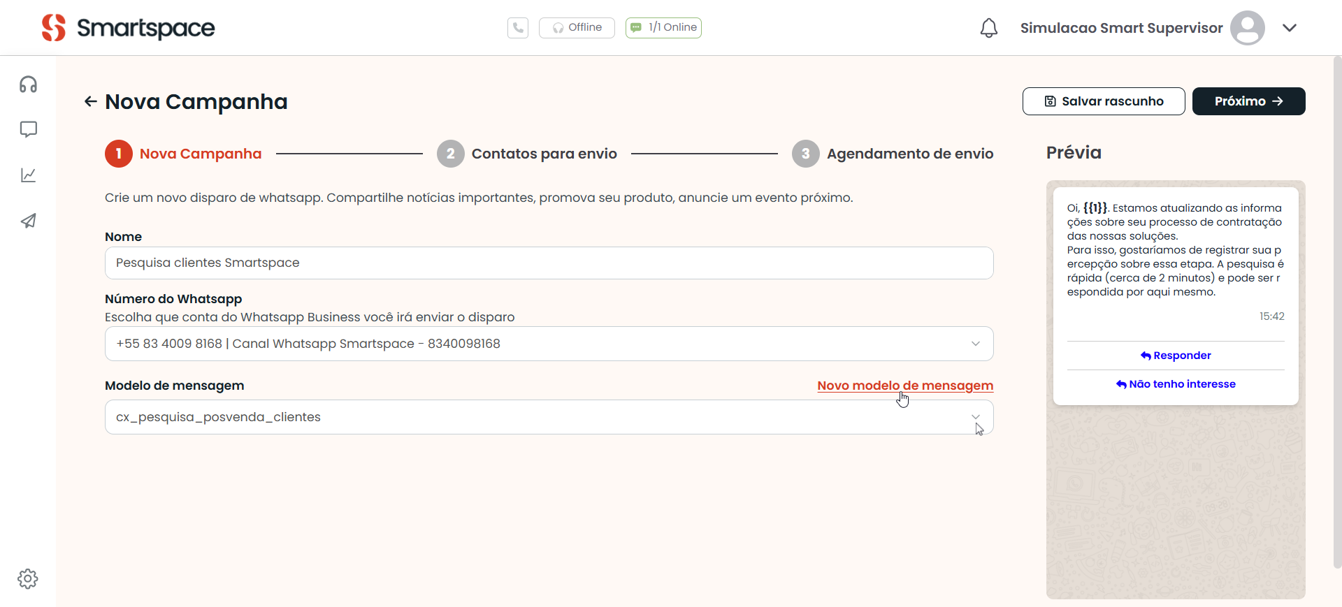Observe que a pré-visualização do Modelo de Mensagem adicionado à campanha é exibida na lateral direita do formulário de criação.
