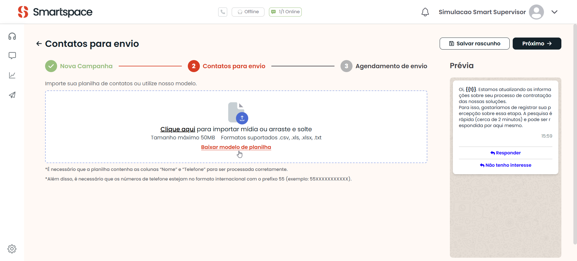 • As Campanhas aceitam listas de contatos em arquivos de até 50 MB, nos formatos .CSV, .XLS, .XLSX e .TXT.