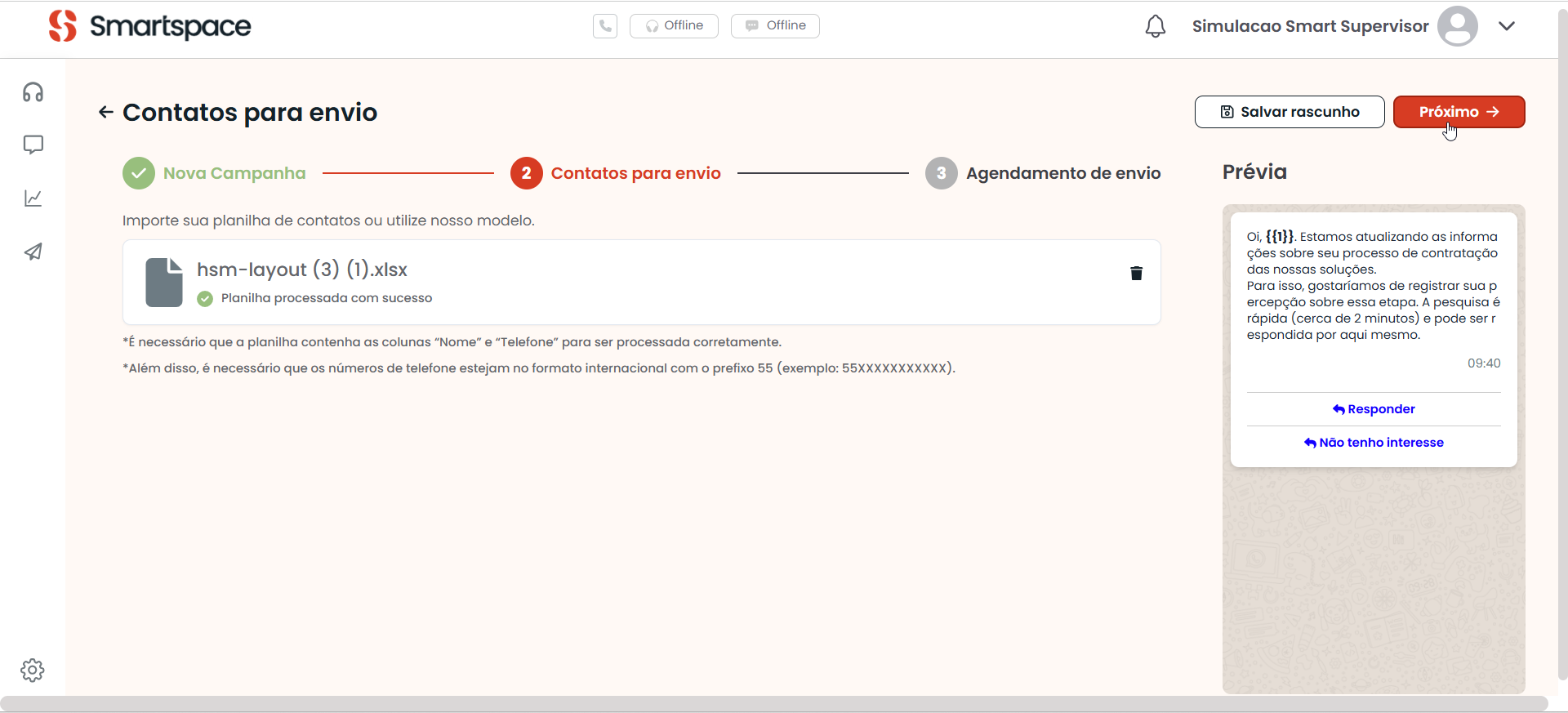 Segunda etapa da Configuração: Na aba Contatos para envio faça upload da planilha contendo "nome" e "número do WhatsApp" dos destinatários da campanha.