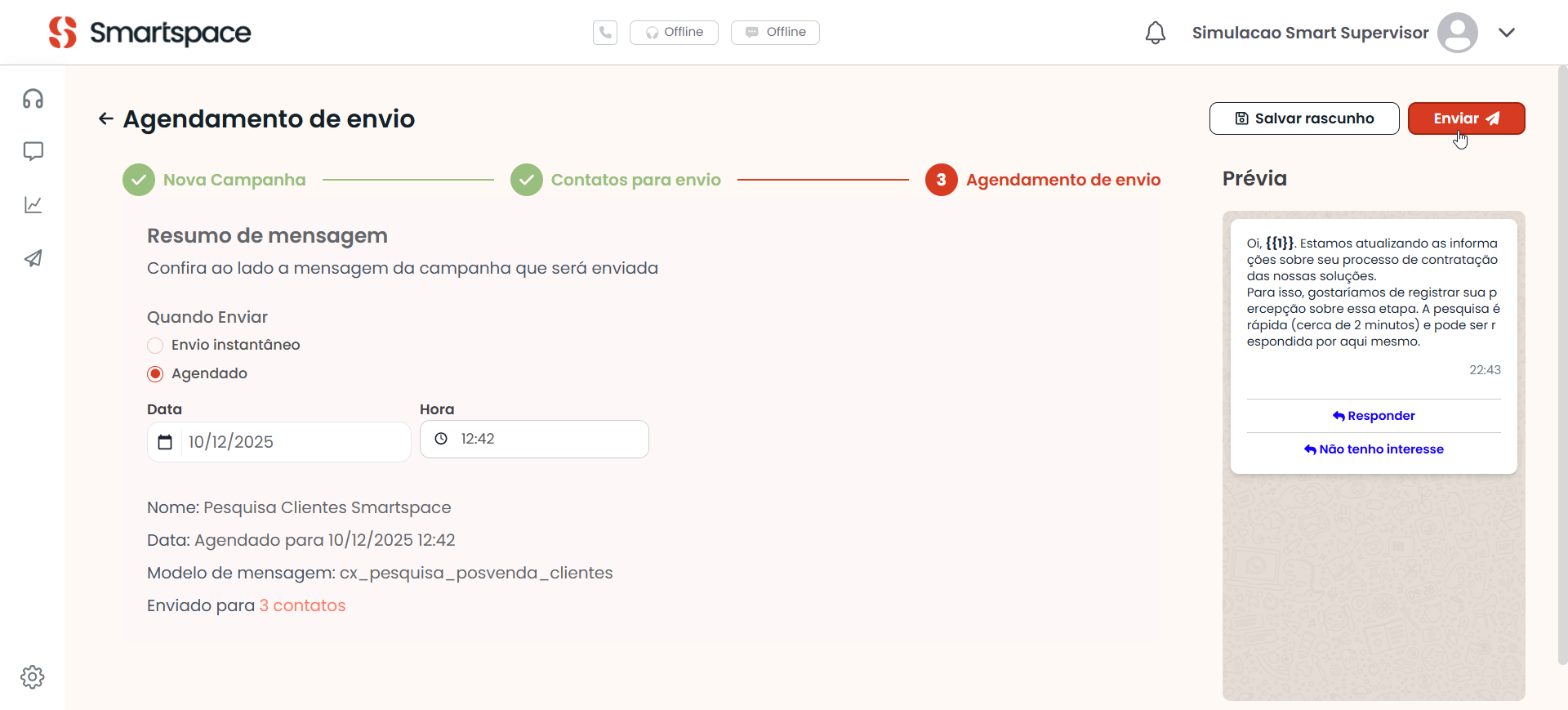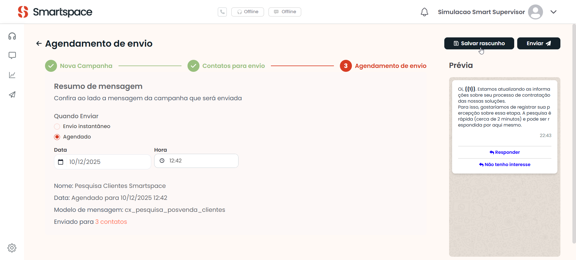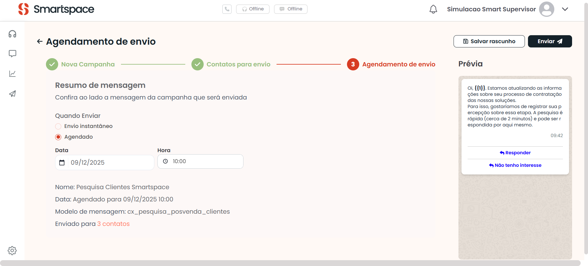 No topo da tela clique em Salvar rascunho para continuar a configuração mais tarde. Ou Próximo, para acessar a etapa de Agendamento de envio. -