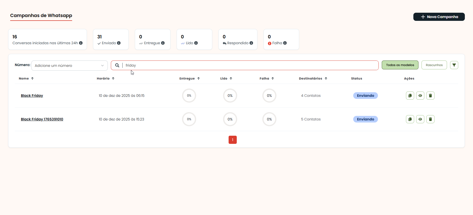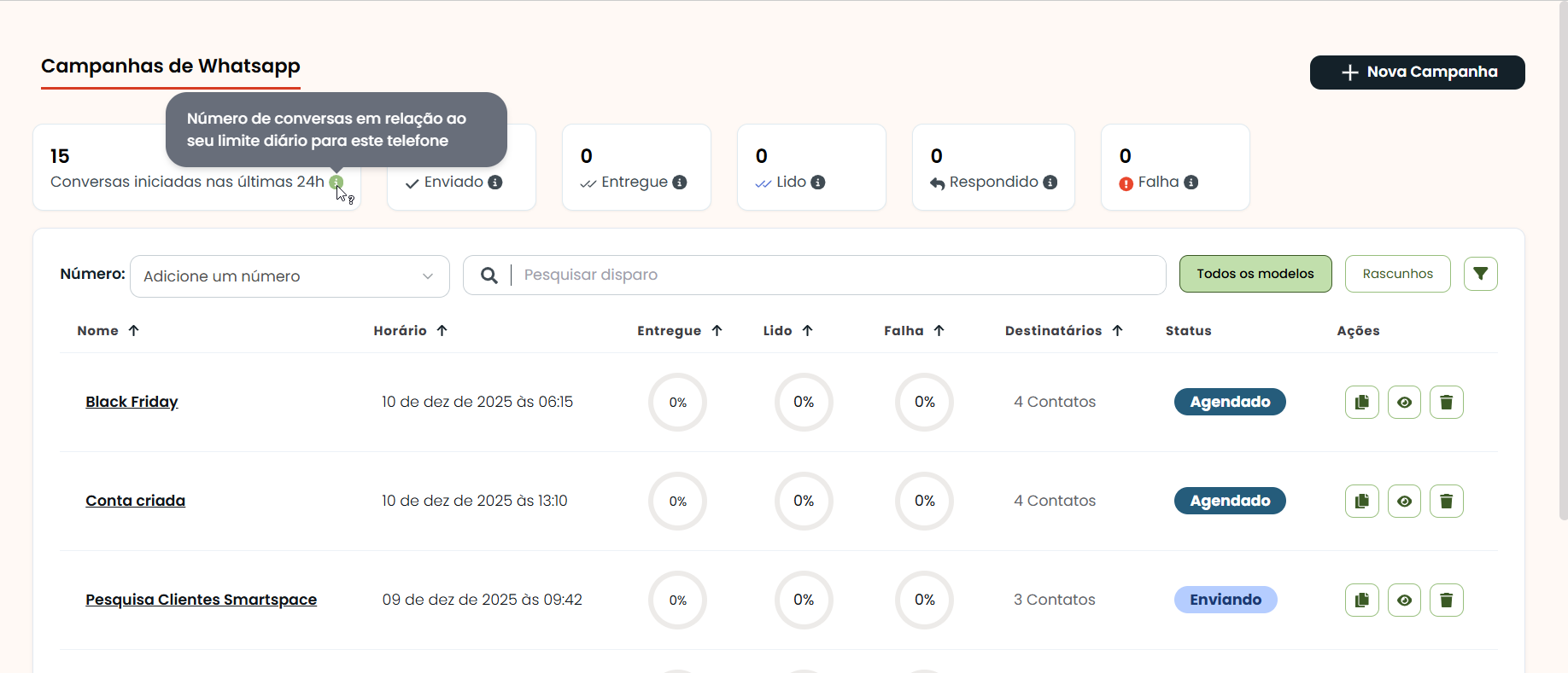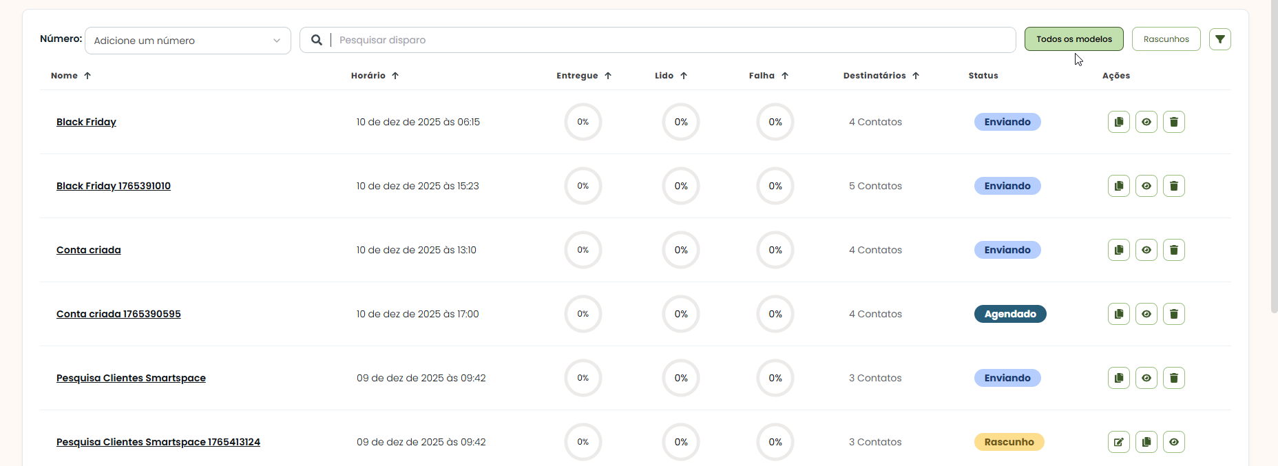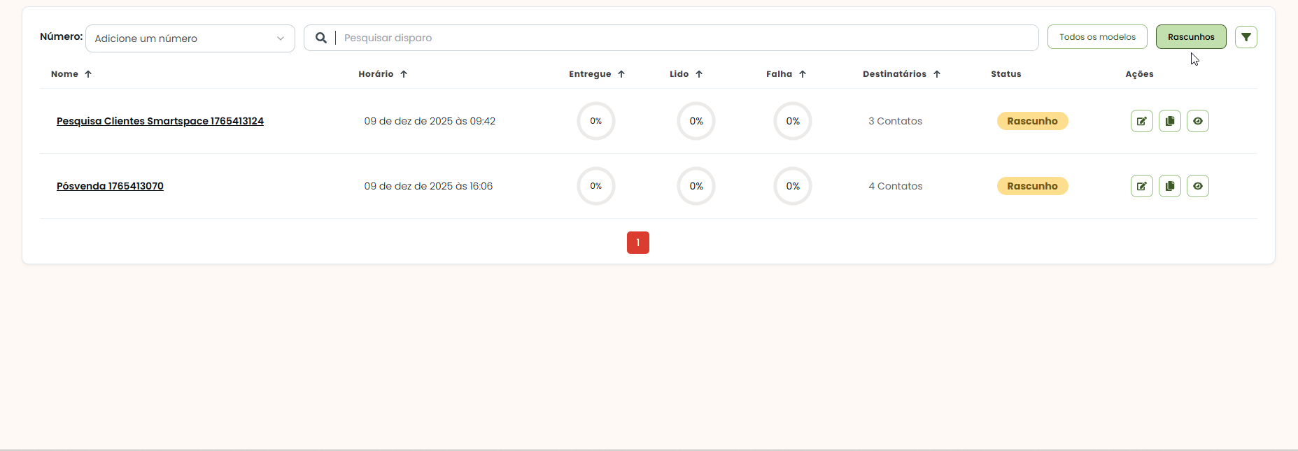 - Rascunho: Campanhas em que o disparo ainda não foi ativado.
