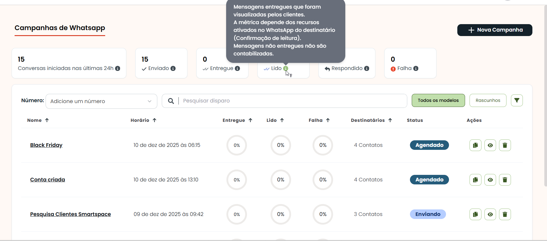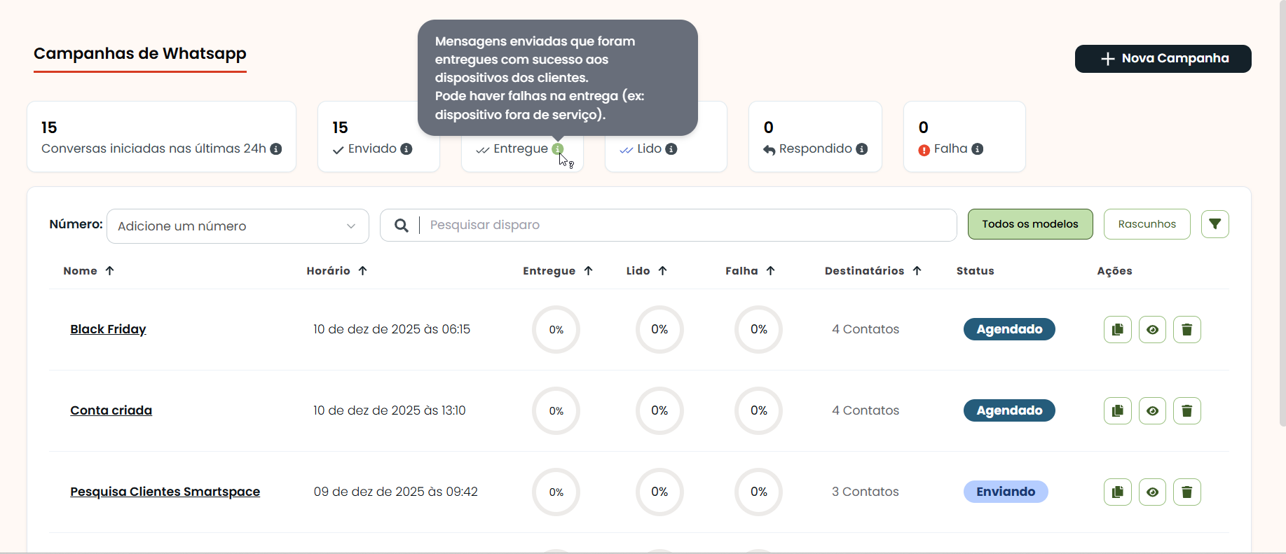 • Entregue (%): Progresso das entregas de mensagens, representado por um círculo de progresso contendo o percentual de entrega de cada campanha.