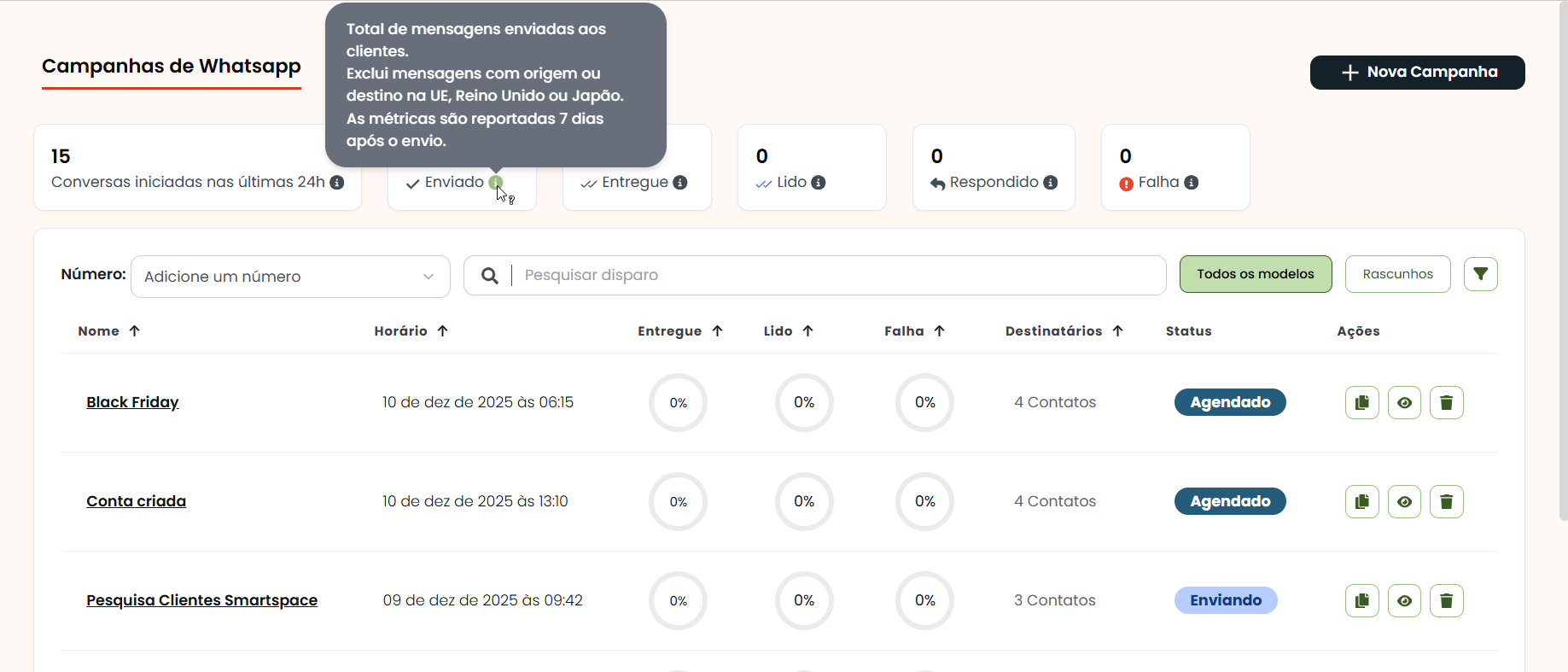 • Enviado: Número total de mensagens enviadas com sucesso para destinatários.