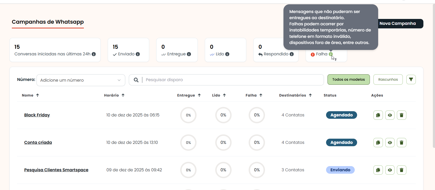 • Falha (%): Percentual de mensagens que não foram entregues aos destinatários.