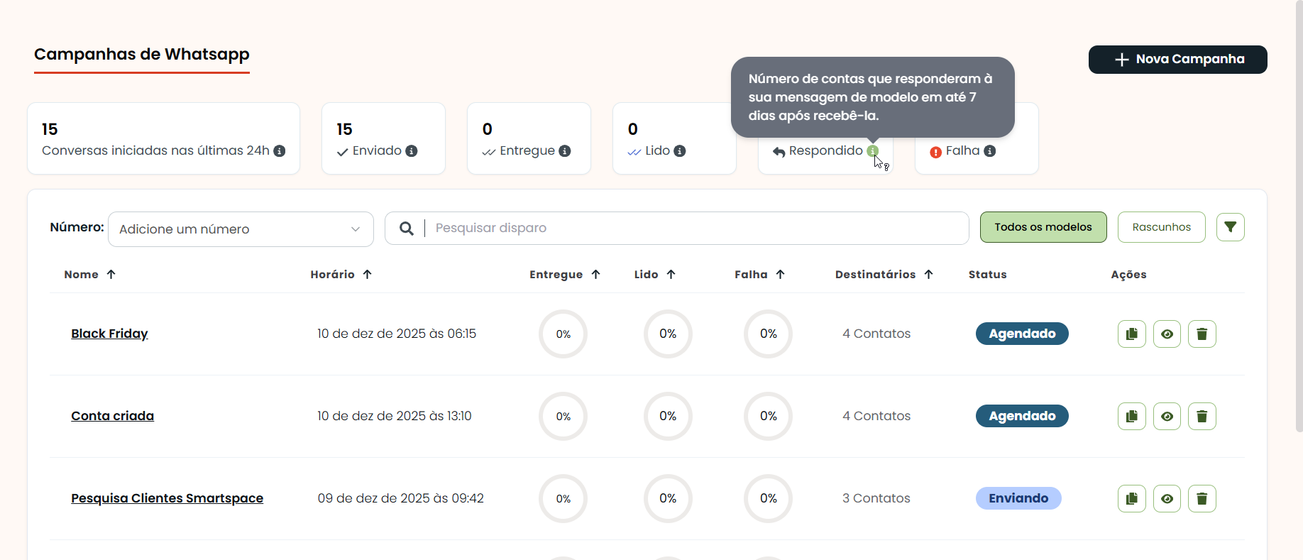 • Respondido: Quantidade de contas de WhatsApp que responderam a mensagem da campanha até 7 dias após recebê-la.