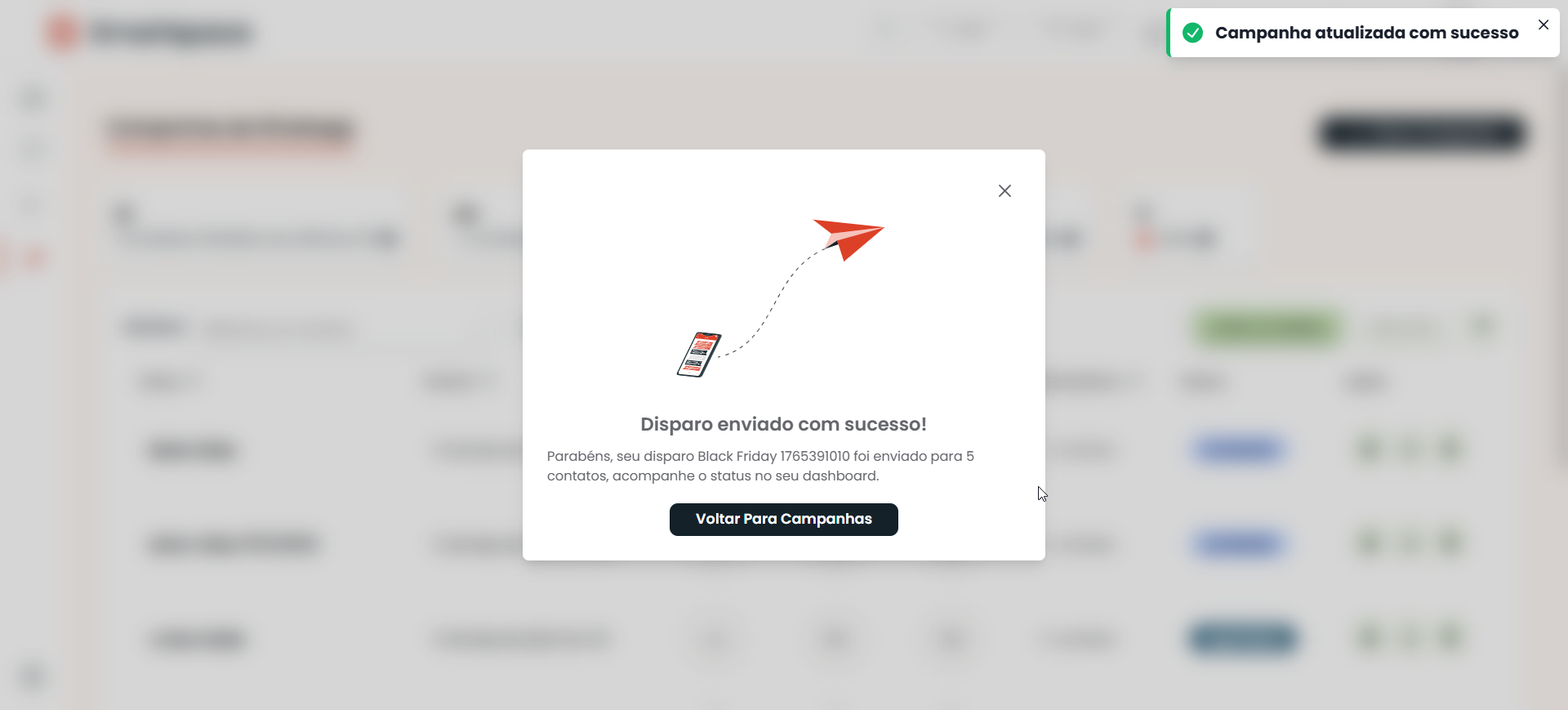 → Excluir: Apaga a campanha definitivamente após confirmação via pop-up de alerta.Os alertas carregados na tela variam de acordo com o status da campanha: