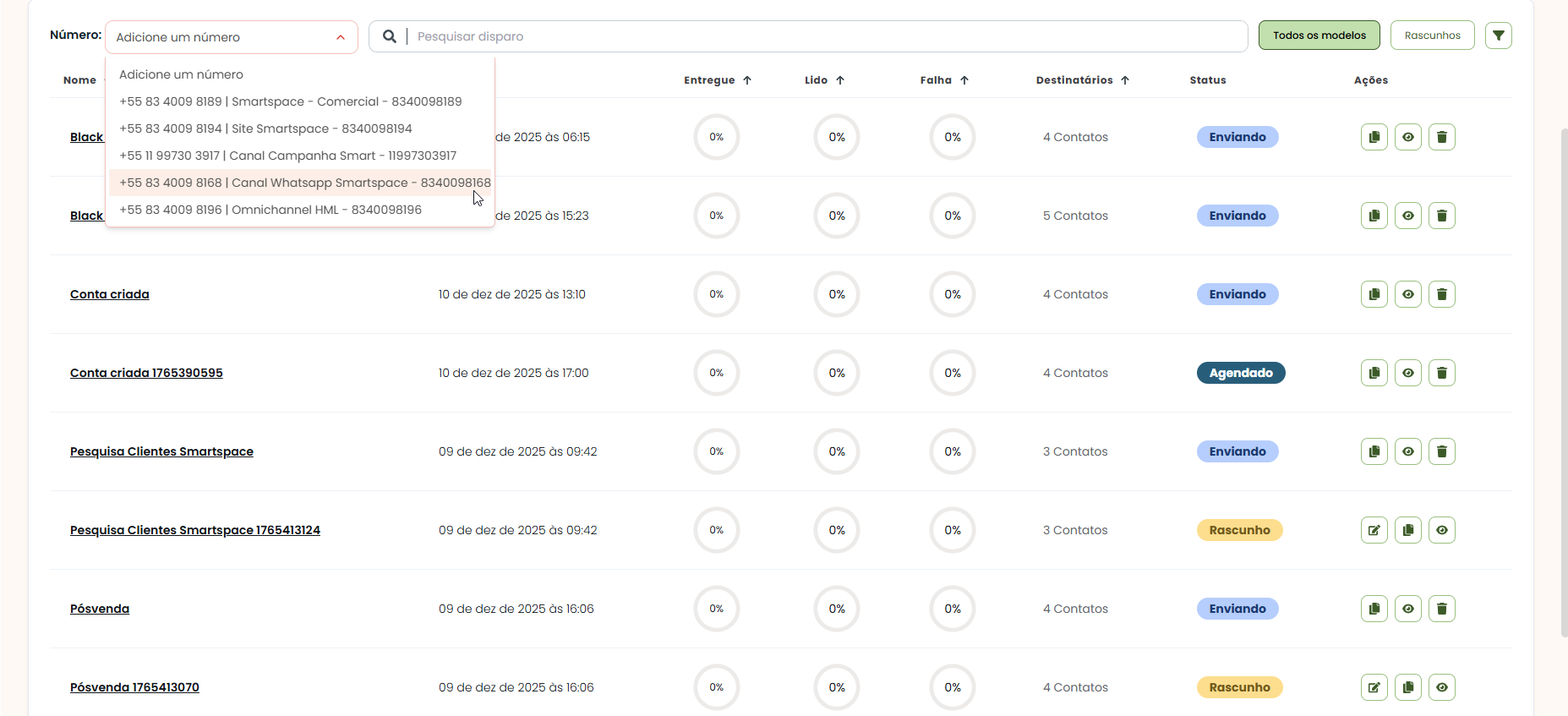 • Número: Permite selecionar o número de WhatsApp utilizado no envio de campanhas.