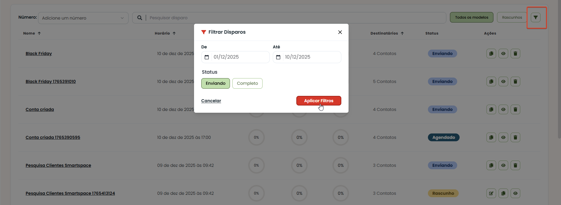 • Filtro Avançado (ícone de funil): Pertmite filtrar disparos de campanhas a partir das seguintes opções adicionais: