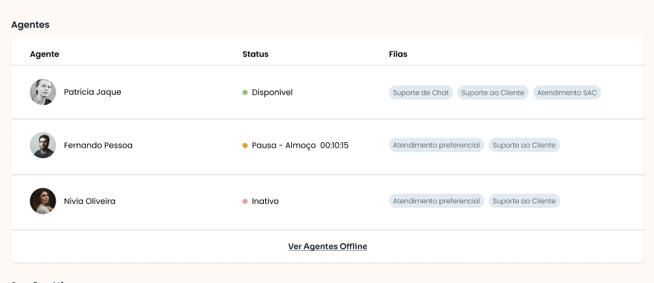Sempre que o Atendente perder a conexão seu status será exibido como Inativo, com o ícone em vermelho, facilitando a identificação de indisponibilidade.