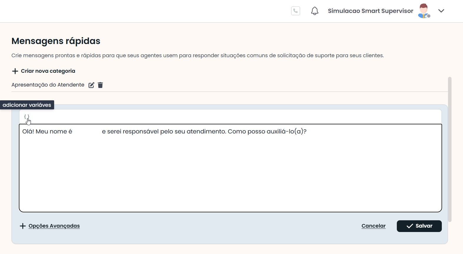 Ao selecionar uma Mensagem pré-definida, as variáveis são substituídas pelas informações do atendimento, evitando que o Atendente tenha que digitar conteúdos repetitivos.