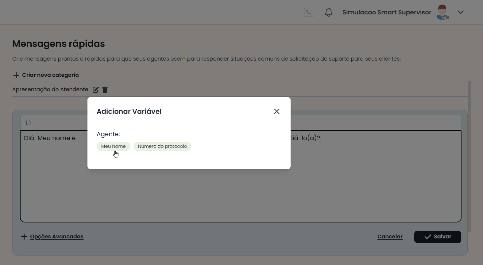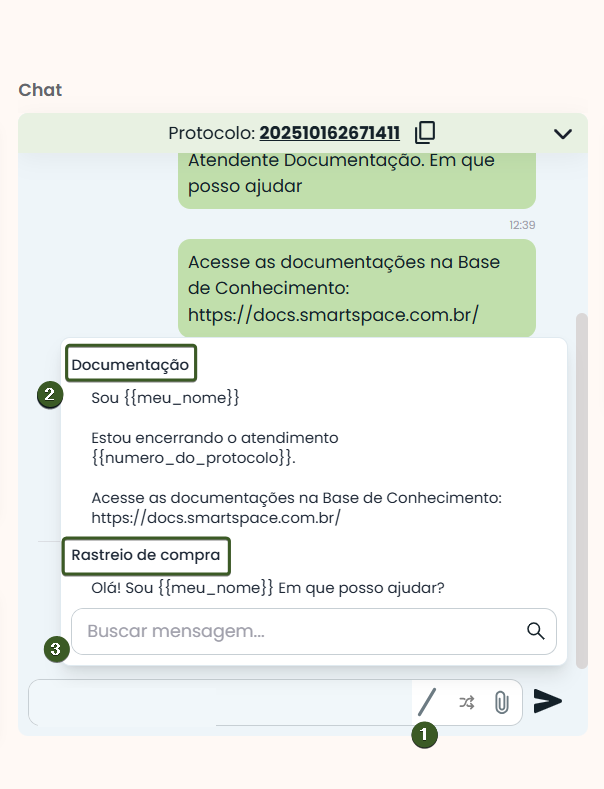 Por padrão, são apresentadas as variáveis de uso comum {{Meu nome}} e {{Número do Protocolo}}, que podem ser selecionadas com um clique.