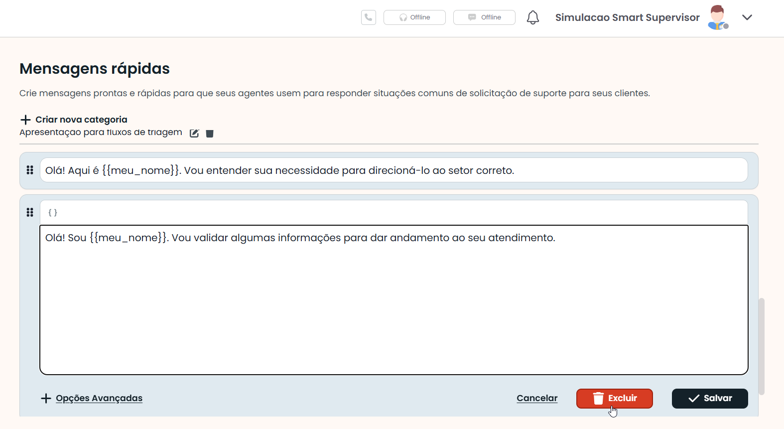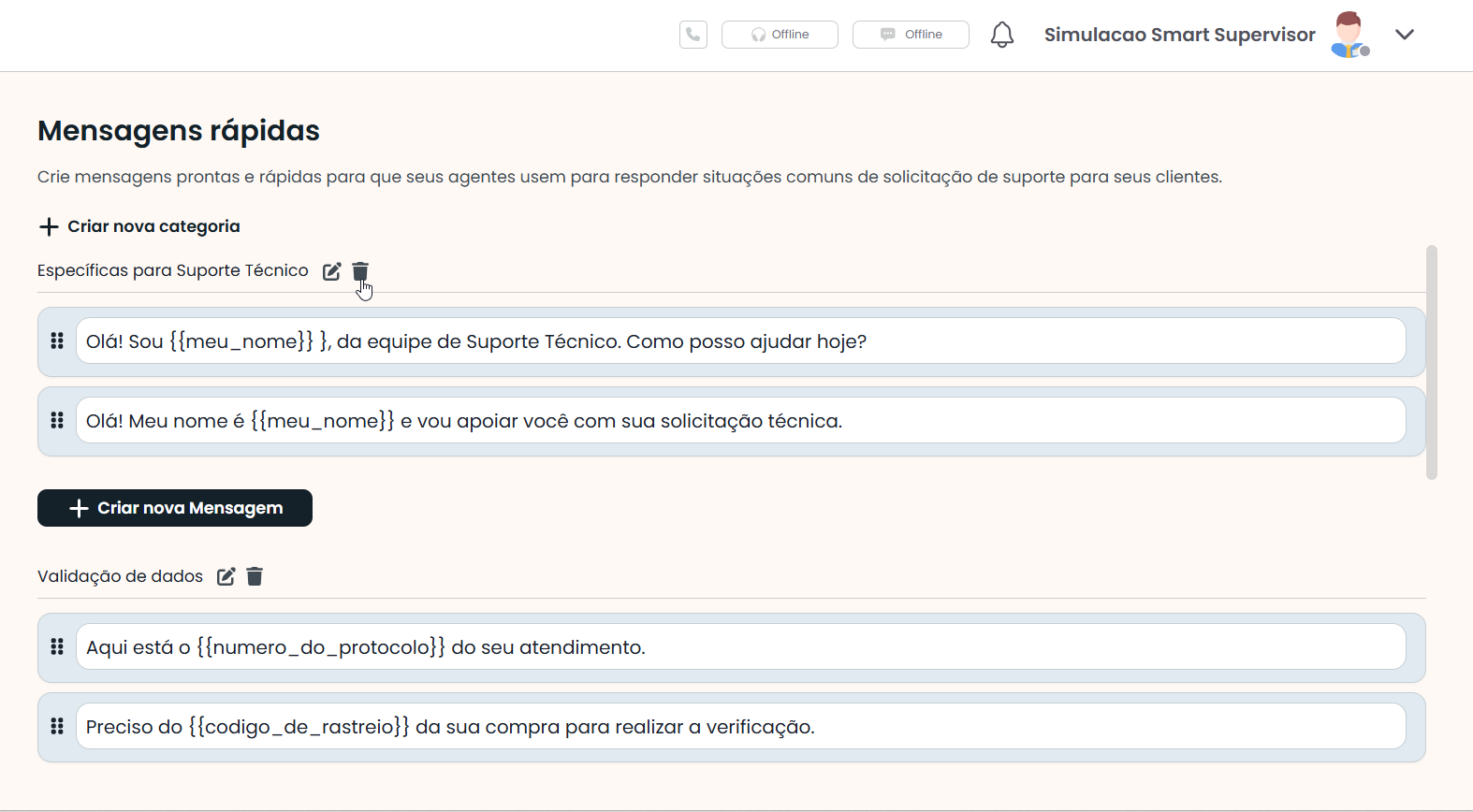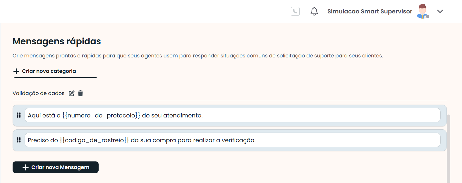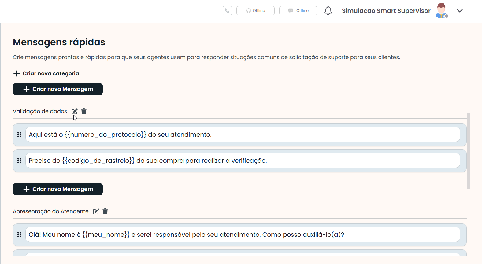 As mensagens são organizadas por categorias, o que facilita a identificação e o uso conforme a finalidade. Por exemplo: “Apresentação do Atendente” e “Solicitação de Dados”.