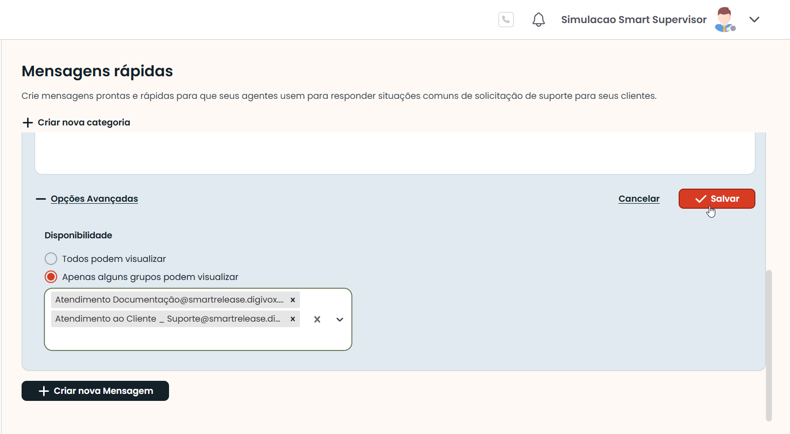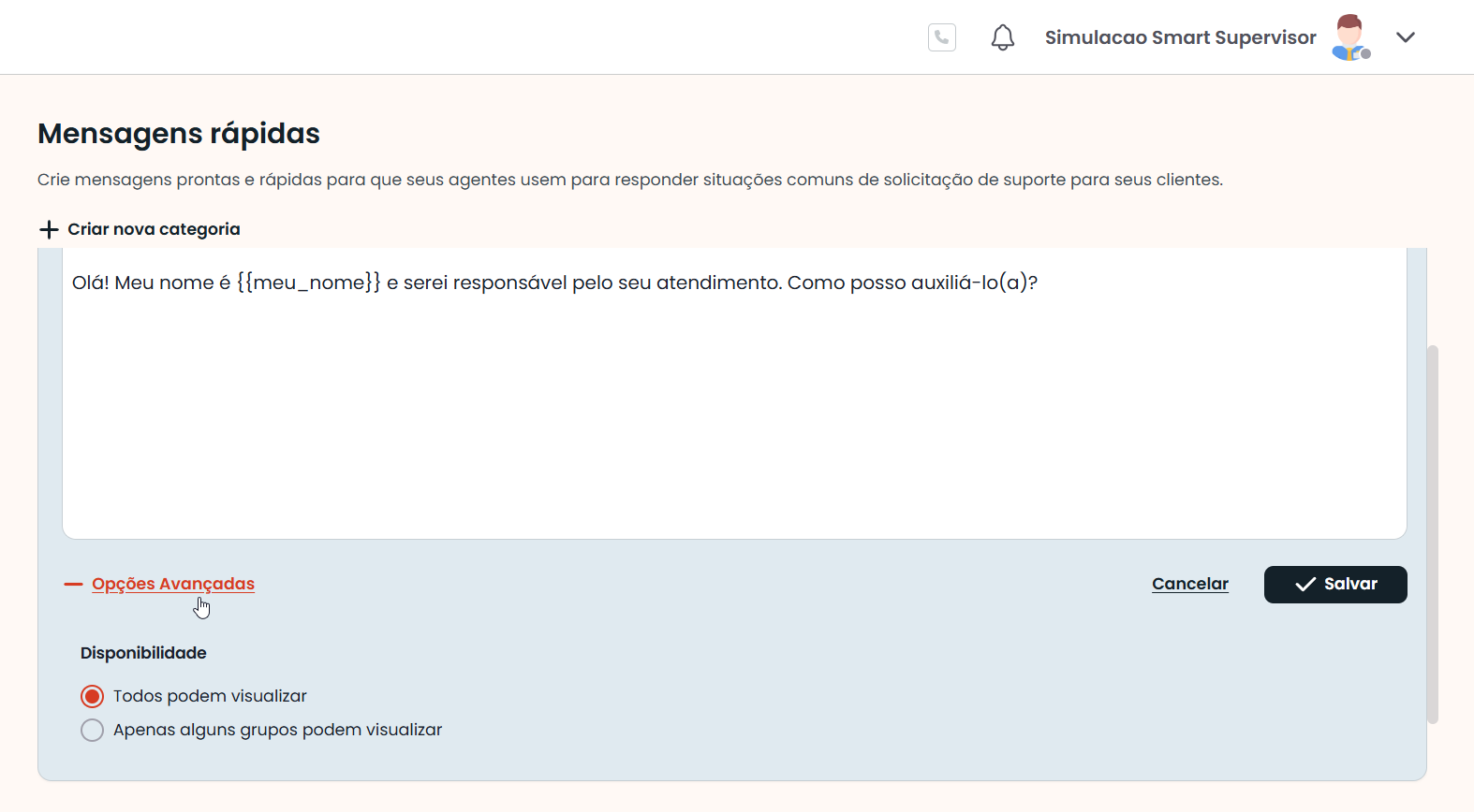* A opção Todos podem visualizar aparece habilitada por padrão. Se o criador da mensagem não alterar a opção, a Mensagem pré-definida será apresentada em todas as filas de atendimento dos canais de chat do Domínio.