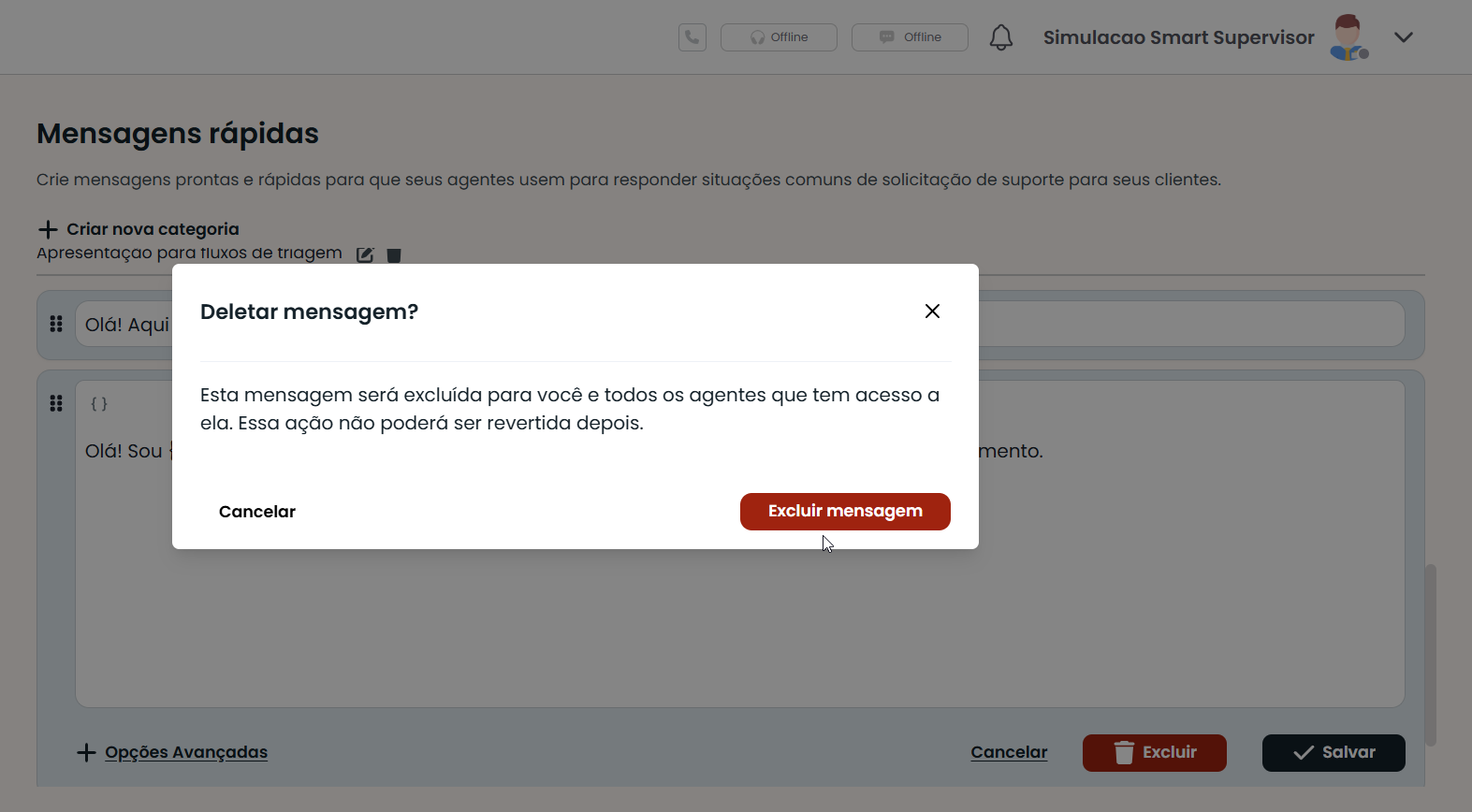 7. Editar e Excluir mensagem: Após a mensagem ser criada, ao clicar nela é possível editar o conteúdo. O botão Excluir será mostrado abaixo do campo de digitação.