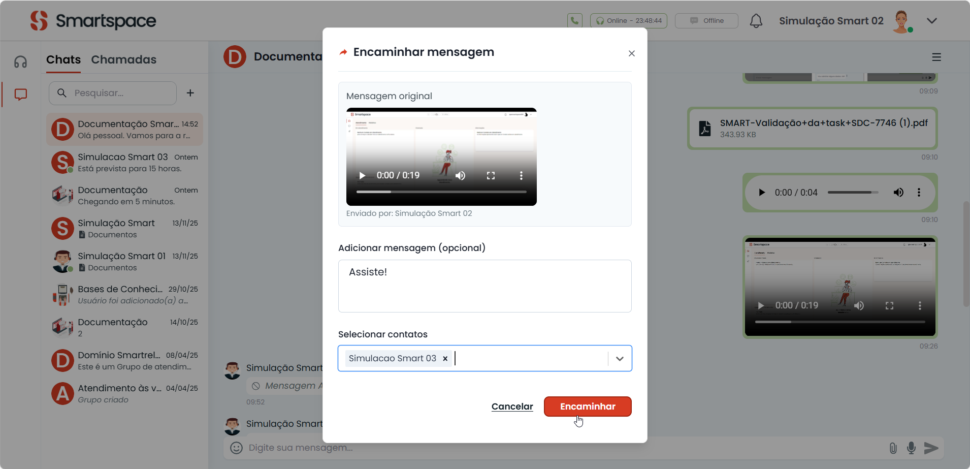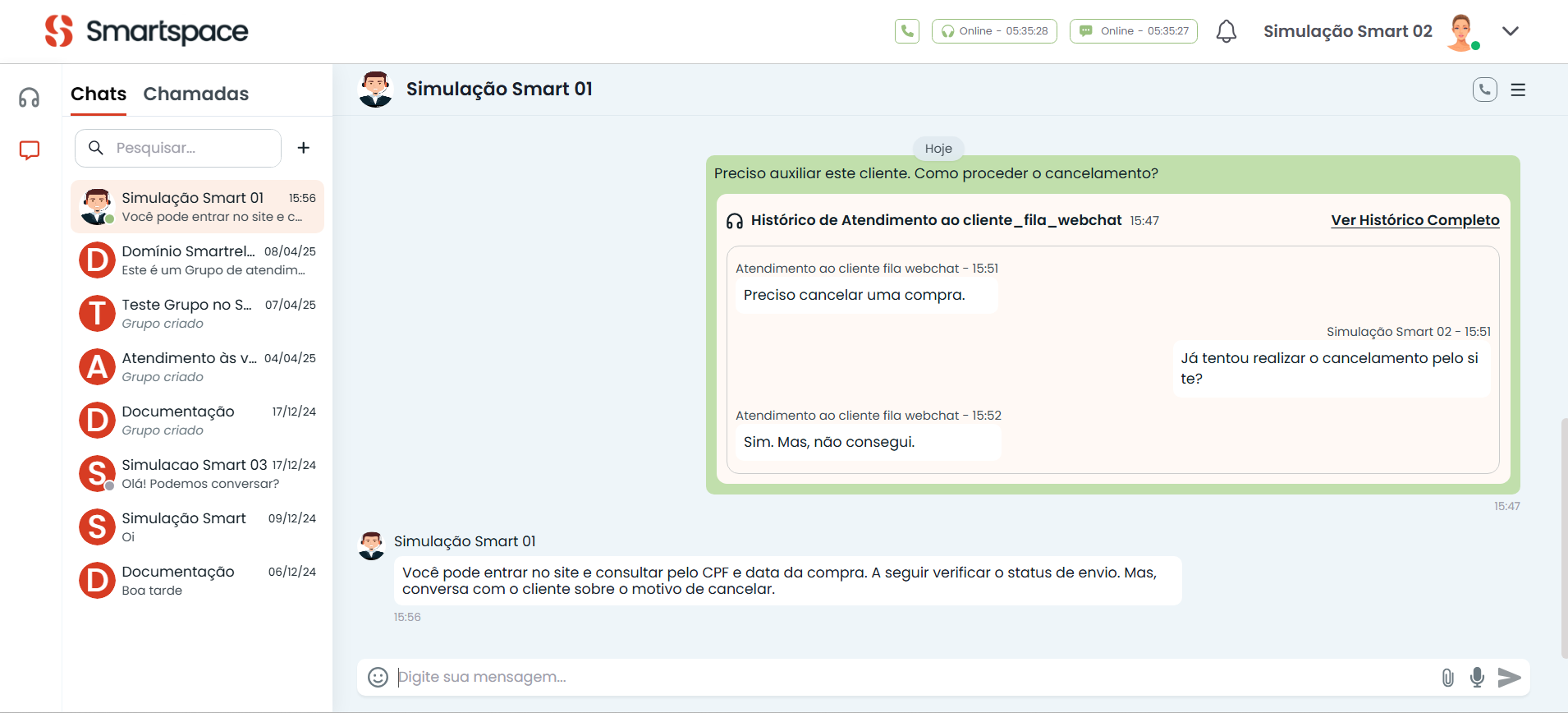 A plataforma Smartspace permite compartilhar o histórico de um atendimento em andamento com cliente por Canal de chat (WhatsApp e WebChat) com outro Atendente ou Supervisor, diretamente pelo Módulo Conversas.