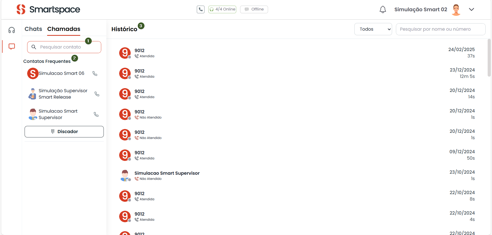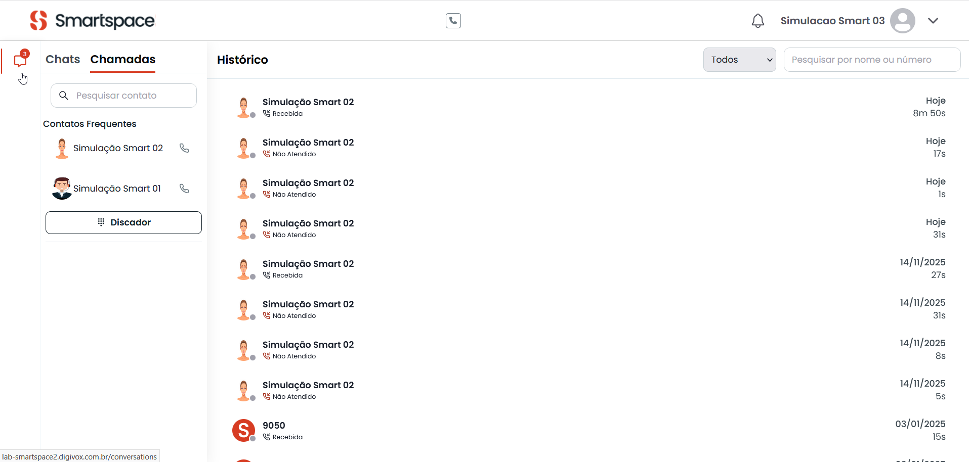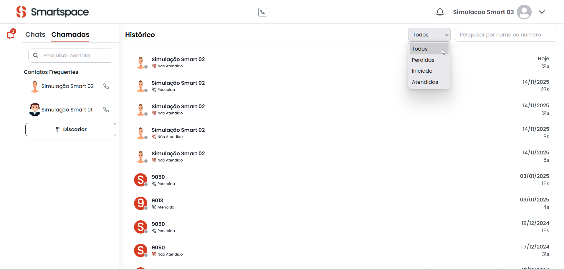 • Seletor de status: Com as opções “Todas”, “Perdidas”, “Iniciadas” e “Atendidas”, permite exibir apenas as ligações do status selecionado.