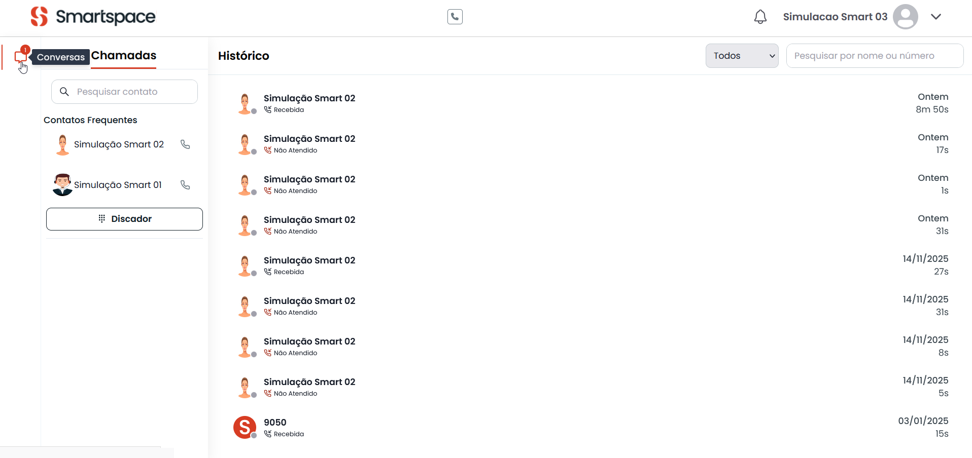 1. Acesse e Módulo de Conversas e selecione a aba Chamadas.