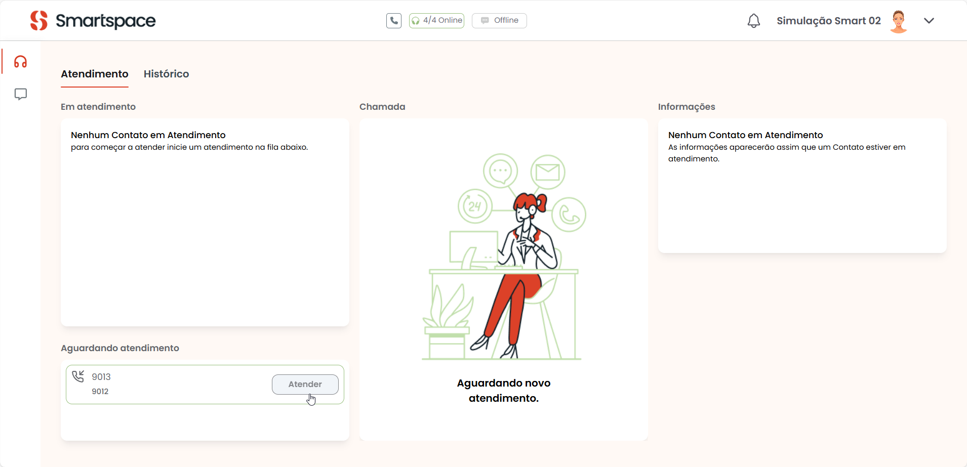 Ao clicar em Atender a ligação seguirá para a seção Em atendimento e e percorrerá o fluxo do Canal de voz .