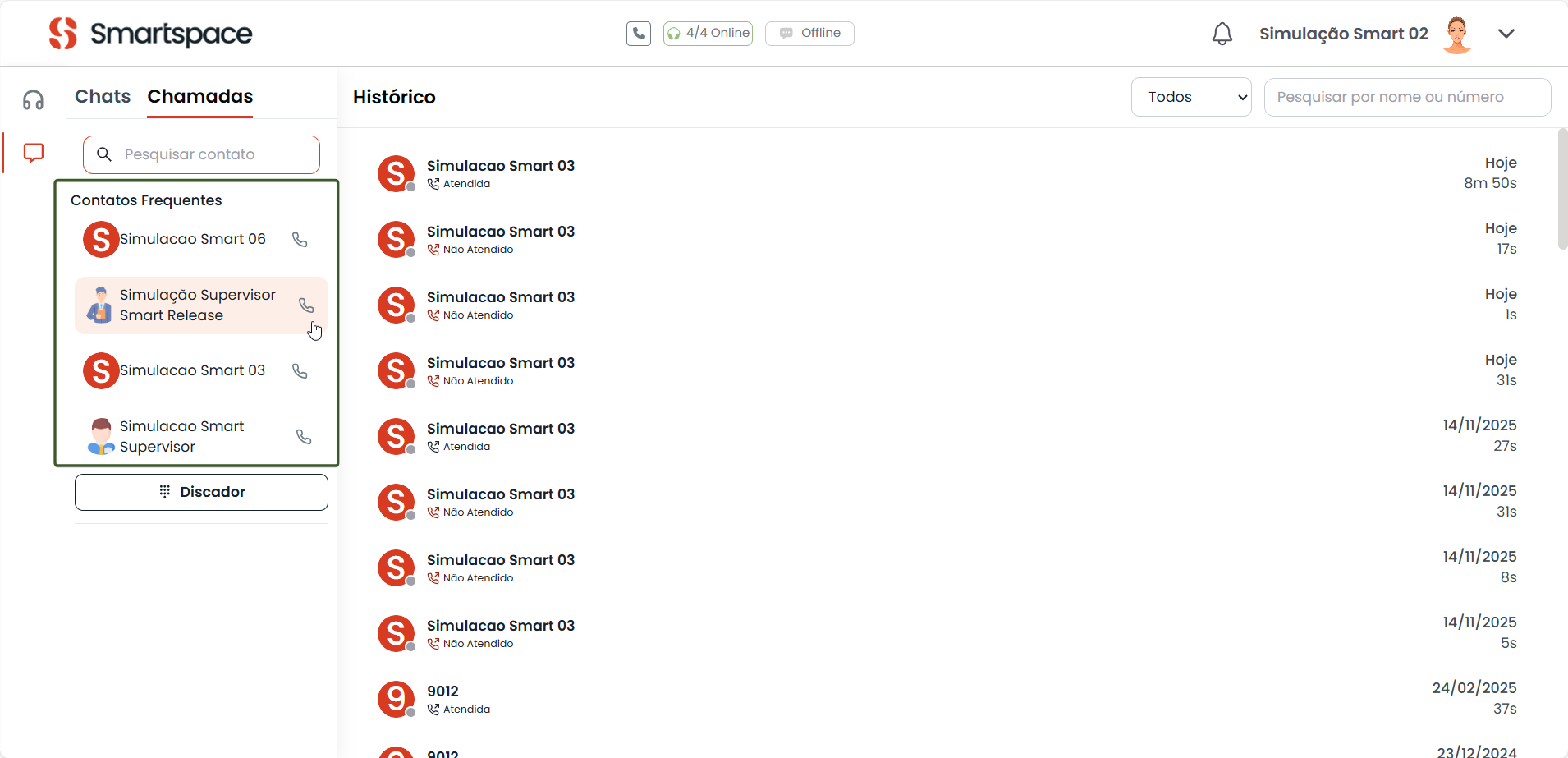 O painel de Contatos Frequentes exibe automaticamente os contatos com os quais o usuário realizou o maior número de chamadas recentemente.