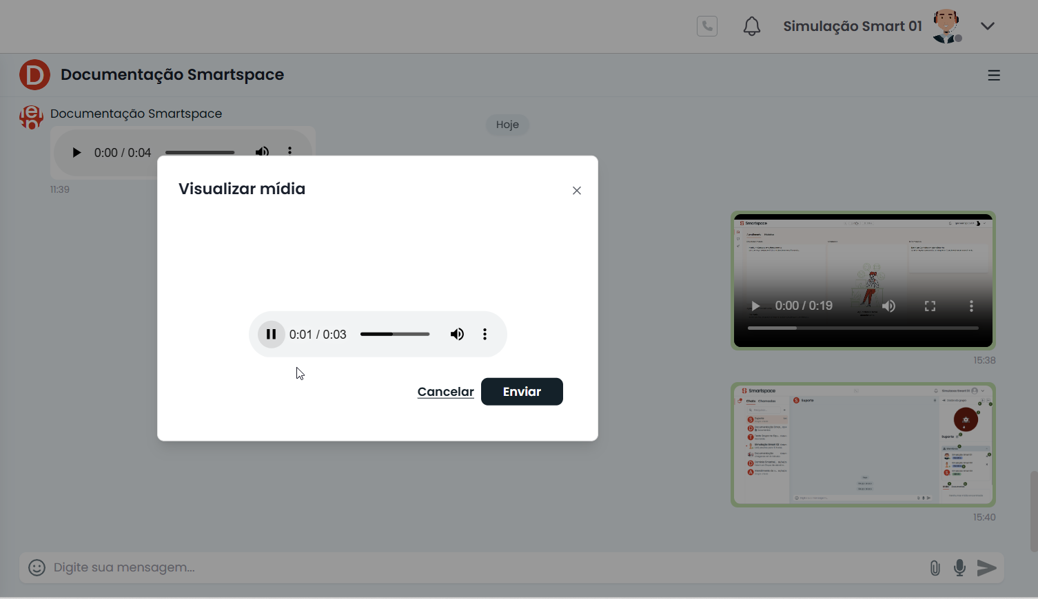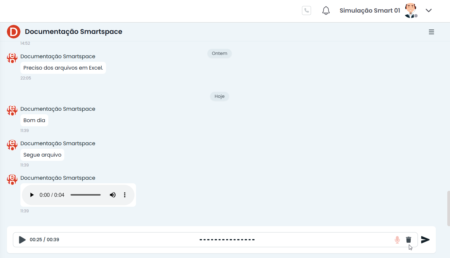 Áudio: Ao pressionar o ícone de microfone, a gravação é iniciada e um contador de tempo disparado. A gravação pode ser encerrada a qualquer momento. Após parar, o botão para reproduzir o áudio é carregado, mostrando tanto o tempo já reproduzido como a duração total da gravação. O usuário pode optar por excluir  (ícone de lixeira) ou Enviar a gravação pelo chat.