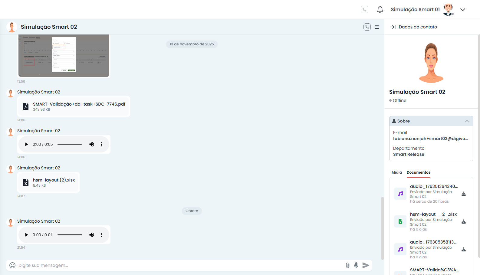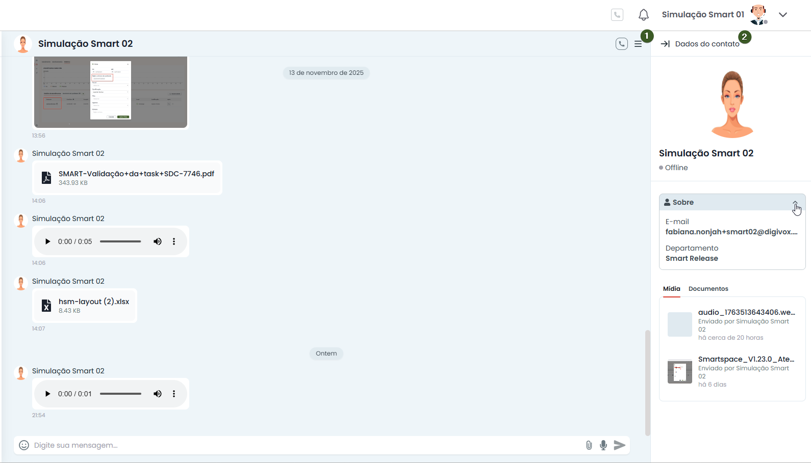 • As Mídias e Documentos compartilhados em conversas com o contato também podem ser vistas e, quando necessário, é possível abrir para visualização em nova aba do navegador ou fazer download.