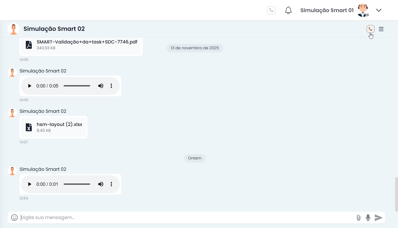 Além de visualizar todo o histórico de mensagens exibido em ordem cronológica (“Hoje” , “Ontem” e por data para mensagens mais antigas), o usuário poderá iniciar novas conversas utilizando o campo de digitação e os recursos de:
