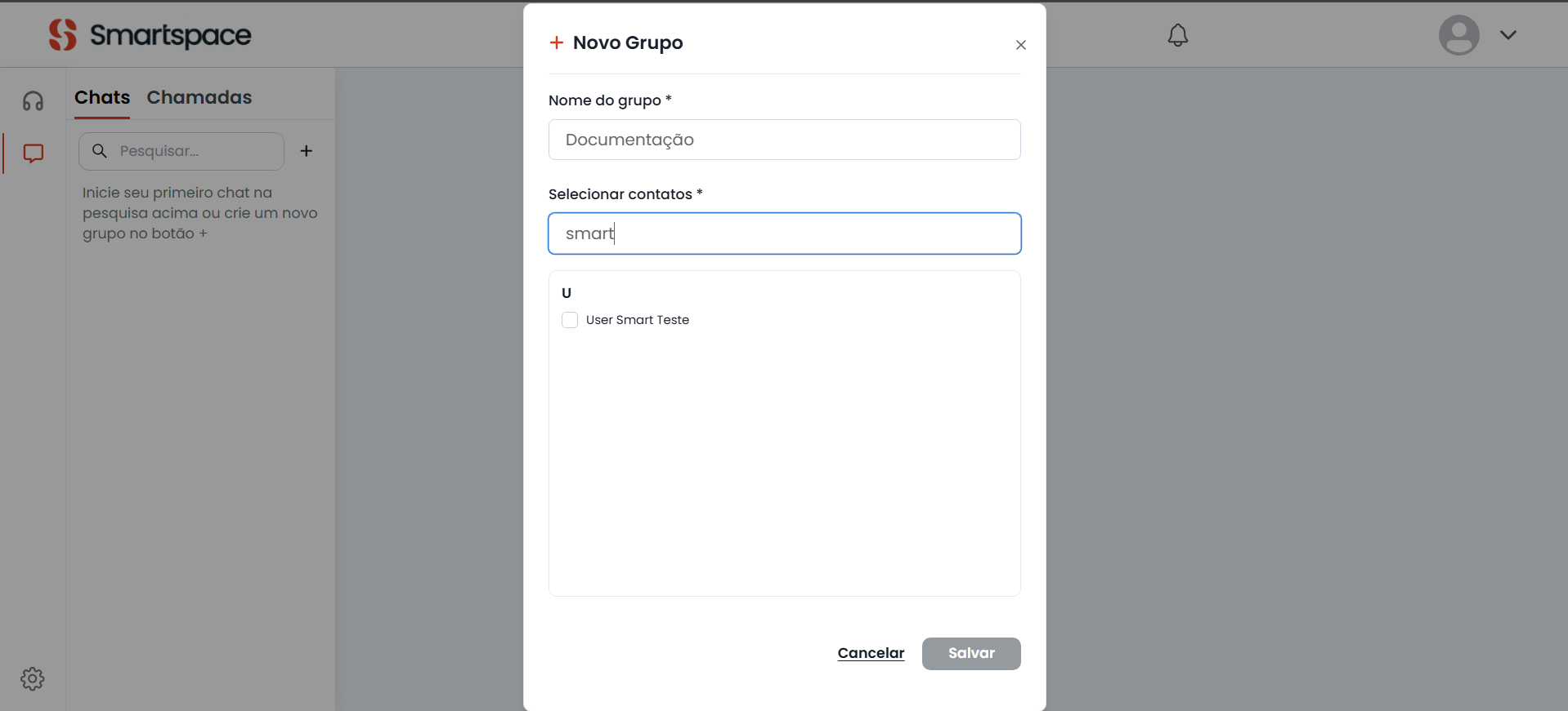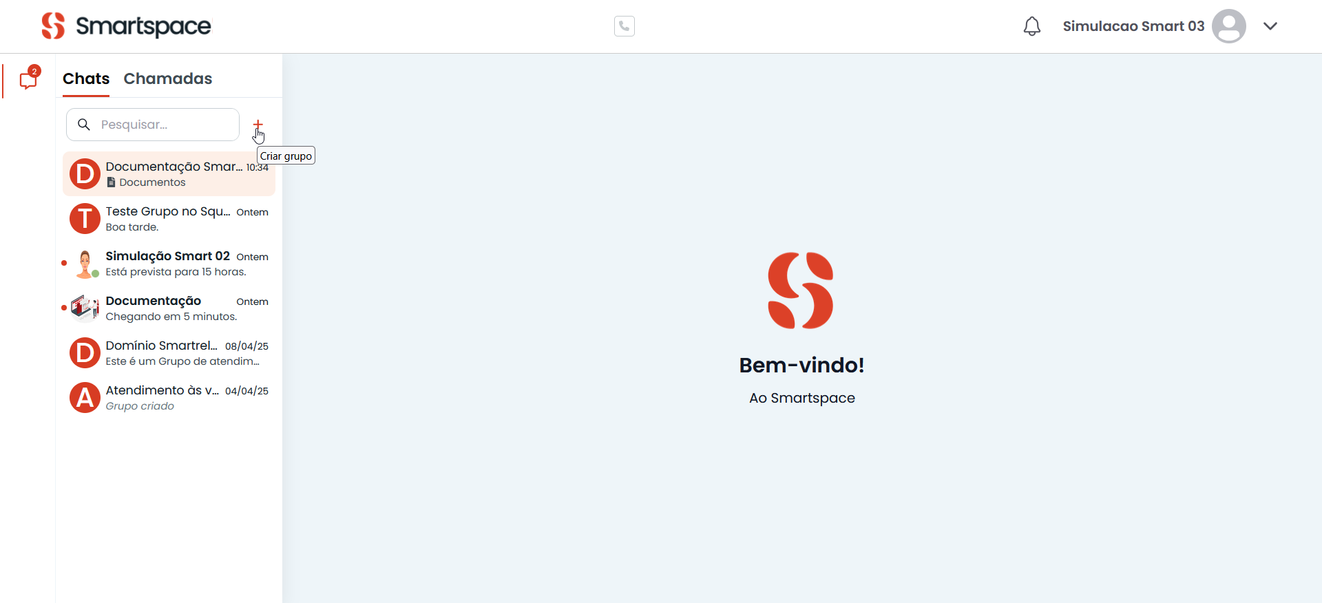 1. Criar Grupo: Acesse o Módulo de Conversas. Clique na aba Chats e, a seguir, pressione o icone "+" ao lado do campo de pesquisa.