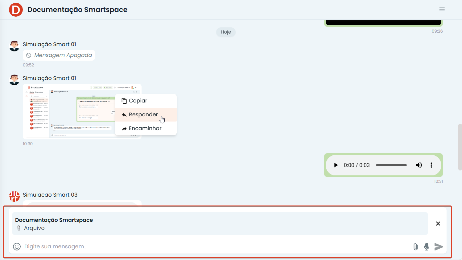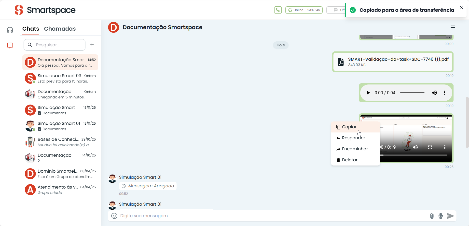 Ações aplicáveis às mensagens: O usuário ainda pode Copiar, Responder, Encaminhar e Deletar mensagens clicando no ícone de três pontos ao lado delas (texto, mídia ou documento).