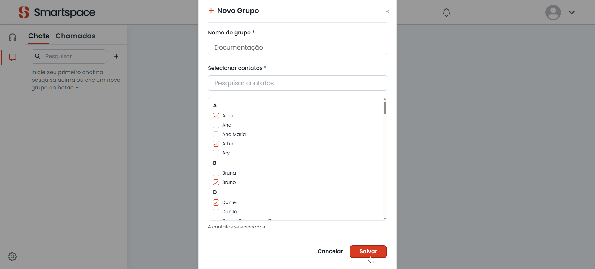 • Membros do grupo: Procure contatos pelo campo de busca ou pela barra de rolagem, marcando a caixa de seleção ao lado dos nomes deles.