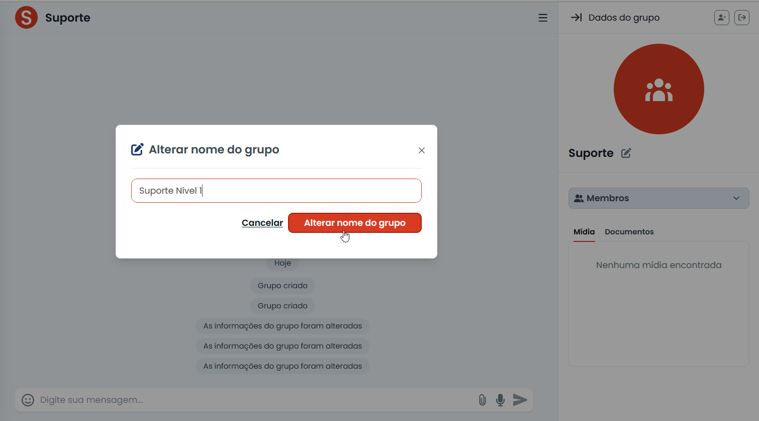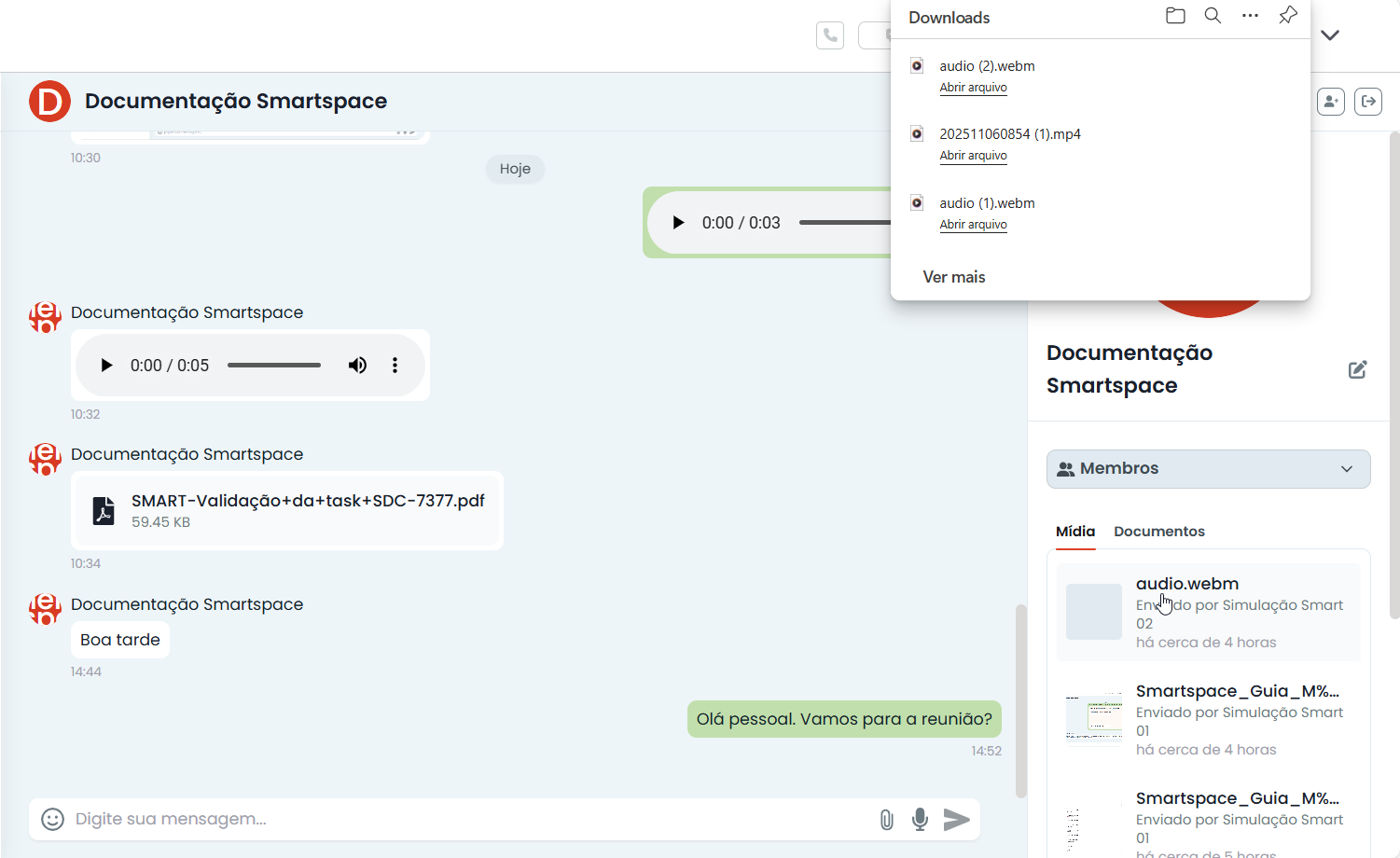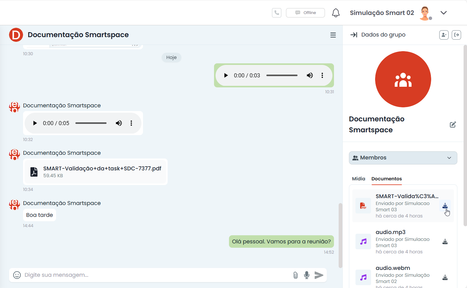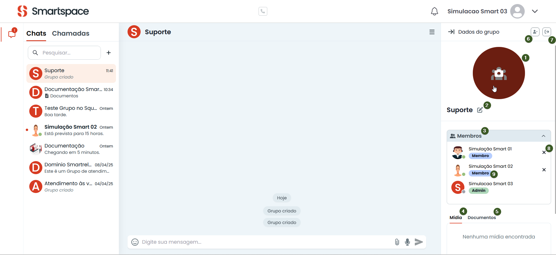 4. Chat do grupo: Mensagens, Mídias e Documentos compartilhados no chat são visíveis para todos os participantes.