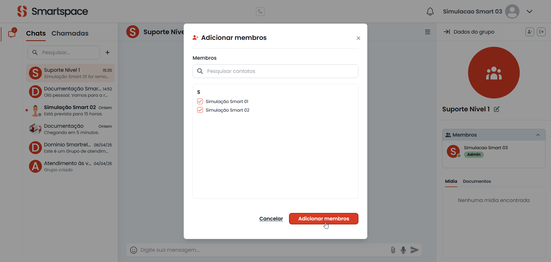6. Adicionar membros: No pop-up aberto ao clicar no botão pesquise pelos contatos no campo de busca ou selecione os listados como disponíveis e clique em Adicionar membros.