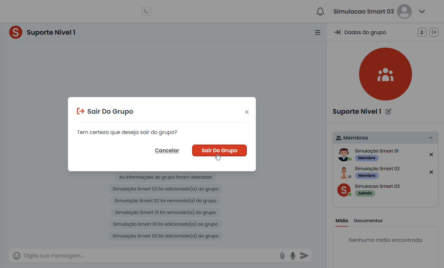*Após sair o usuário não visualizará mais o grupo na listagem da aba Chats. Para voltar a participar, precisará ser adicionado novamente por outro Membro. Ao retornar ao grupo conseguirá visualizar todo o histórico de mensagens.