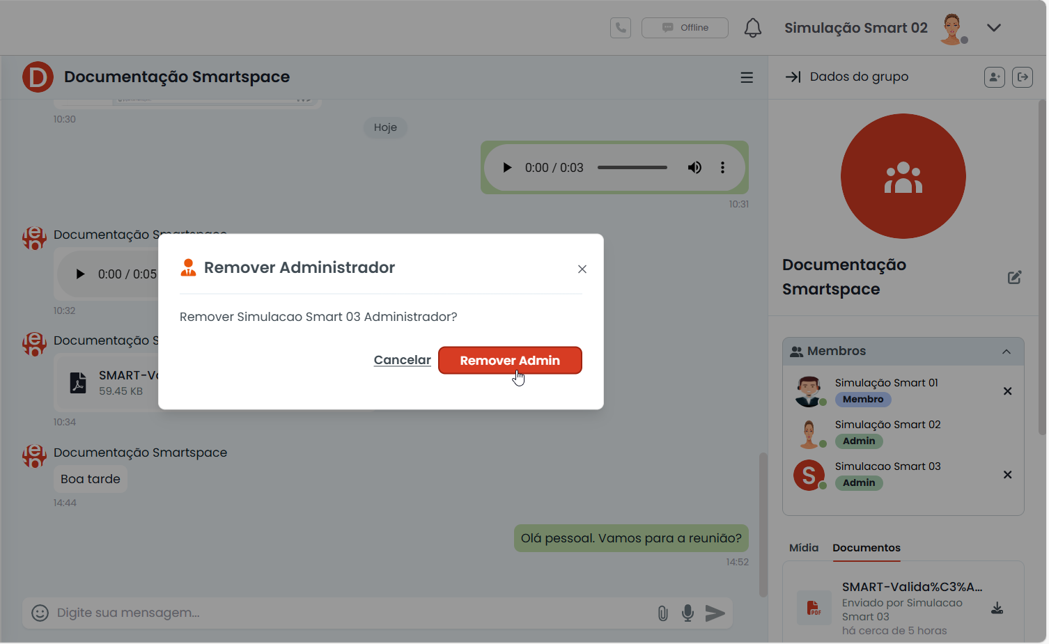Caso deseje alterar o status de um Admin para Membro, é só clicar no status e no pop-up de confirmação pressionar o botão Remover Admin.