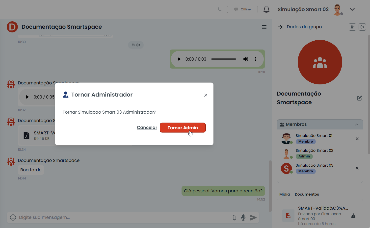 9. Promover Membro: Ao clicar sobre o status de um Membro, o Administrador do grupo será questionado se deseja torná-lo Administrador. Basta pressionar o botão Tornar Admin para confirmar.