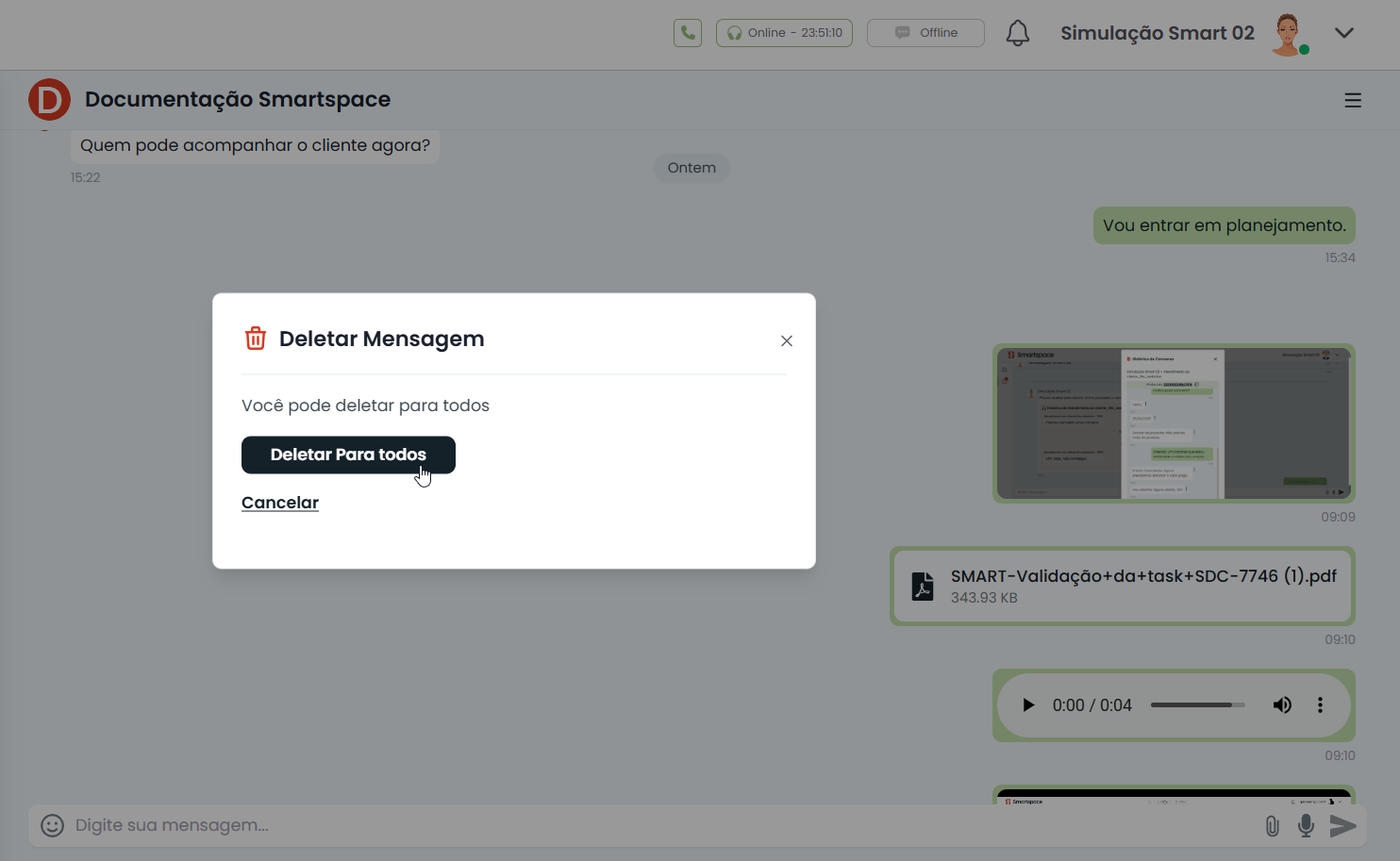 *A ação Deletar pode ser aplicada somente às mensagens que o próprio usuário enviou pelo chat.