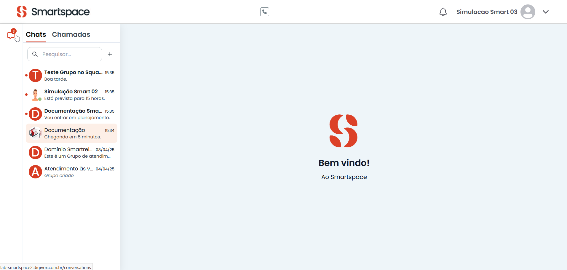 As notificações de novas mensagens recebidas aparecem diretamente no ícone do Módulo de Conversas e também na aba Chats, ao lado do nome do contato ou do grupo que enviou as mensagens.